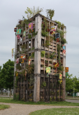 Réalisations suspendues à la tour potagère, Salle K de Schweighouse durant le Festival des contes 2015.